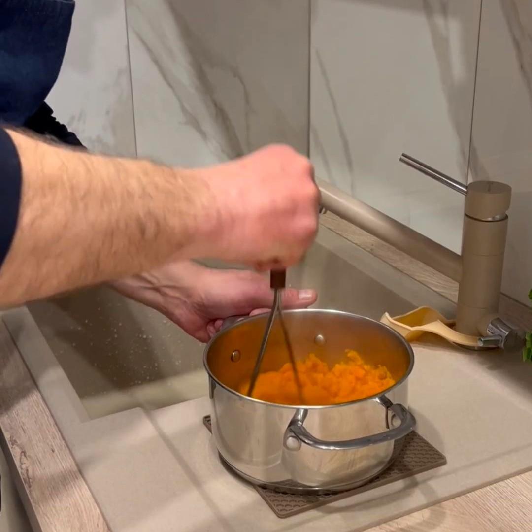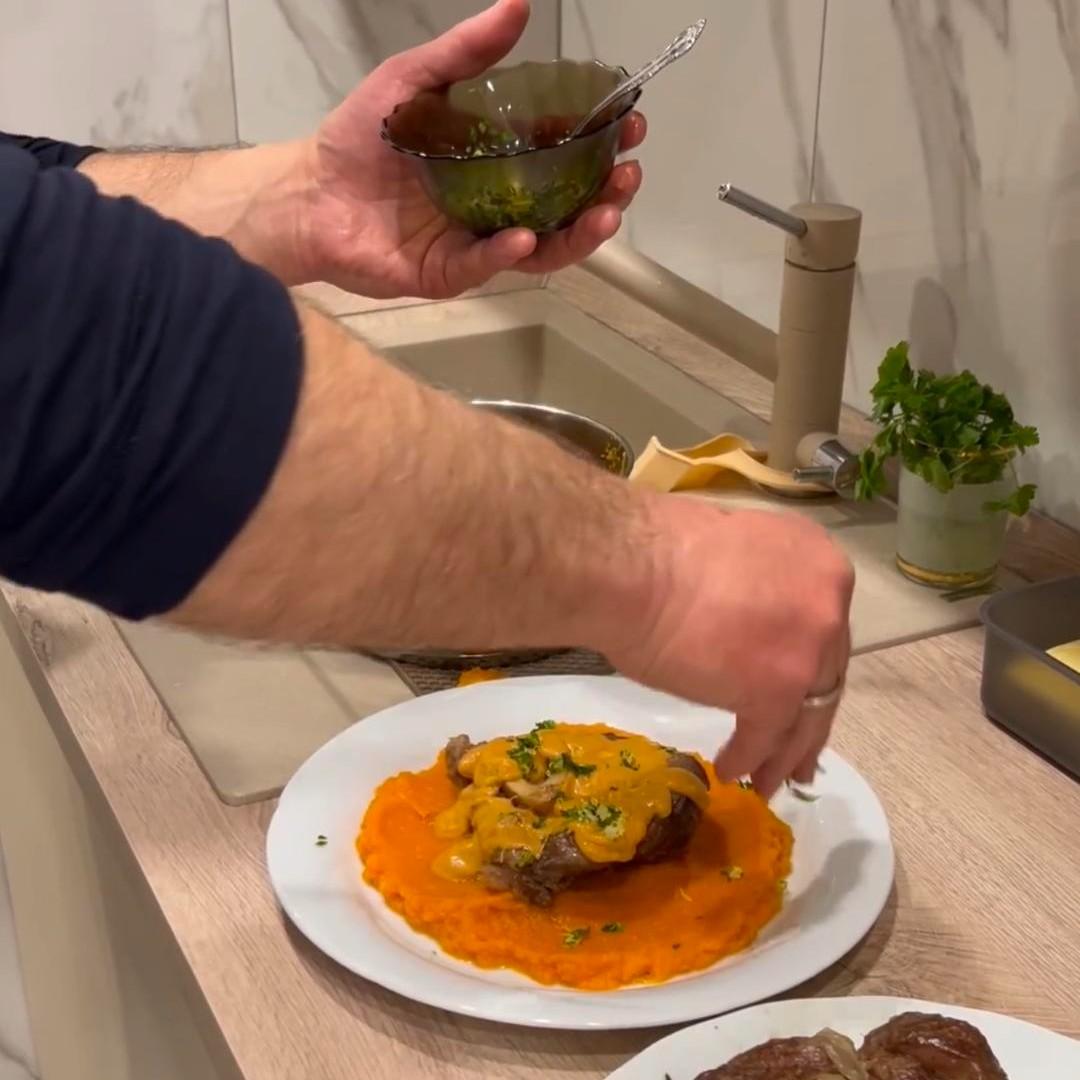 Пока мясо готовится, можно заняться гарниром. Бруслиновский предложил вариант с бататом, который очищают, нарезают, отваривают в подсоленной воде, а затем превращают в пюре с добавлением сливочного масла и тертого сыра.