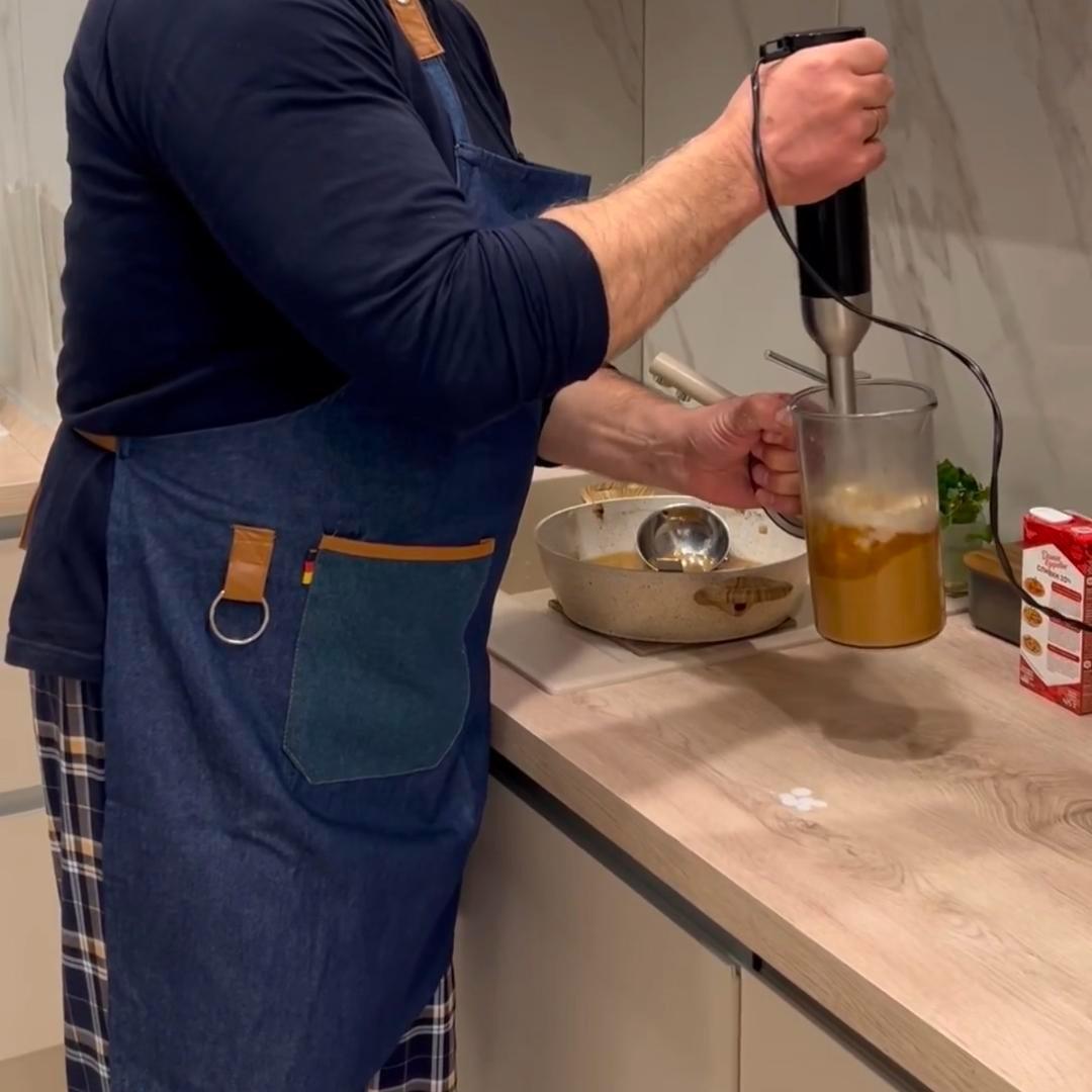 Когда мясо станет очень мягким, его извлекают из соуса. Овощную массу из сковороды взбивают блендером в однородный соус, предварительно удалив палочку корицы и веточки тимьяна. В соус добавляют сливки и снова взбивают.