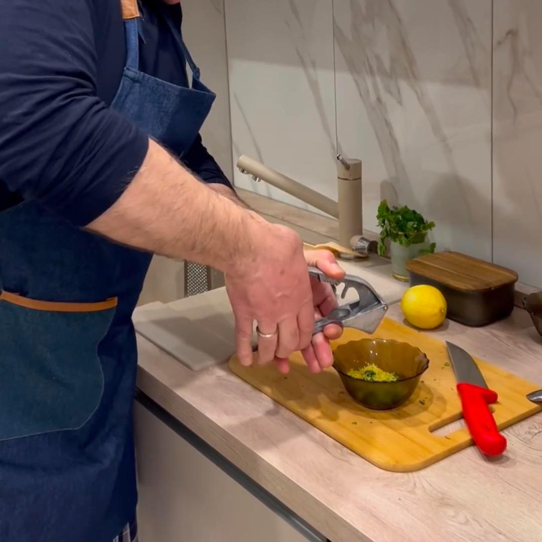 Для финальной посыпки мелко рубят петрушку, смешивают её с натёртой лимонной цедрой и раздавленным чесноком.