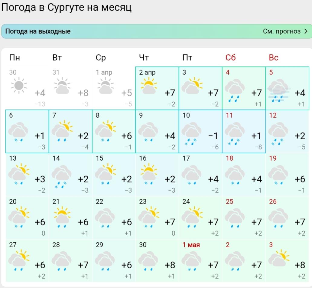 Прогноз температур и осадков для Сургута на апрель.
