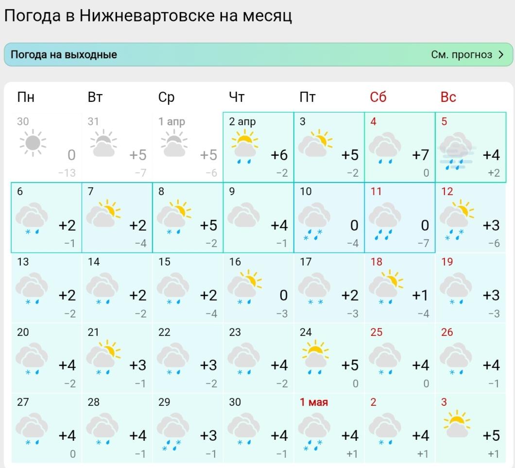 В Нижневартовске днем ожидается от 0 до +7 градусов, ночью — до -7. На протяжении всего месяца здесь прогнозируются дожди с мокрым снегом.